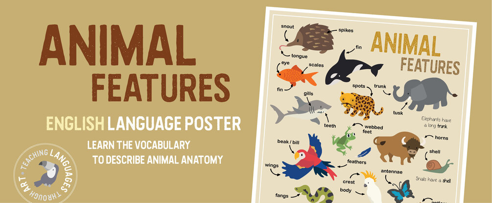 Learn how to talk about ANIMAL FEATURES with this vibrant poster showcasing the main body parts of creatures from all around the globe! From the sharp talons of an eagle to the powerful legs of a tiger, this poster will help you master the language of animal anatomy in a fun and engaging way.
